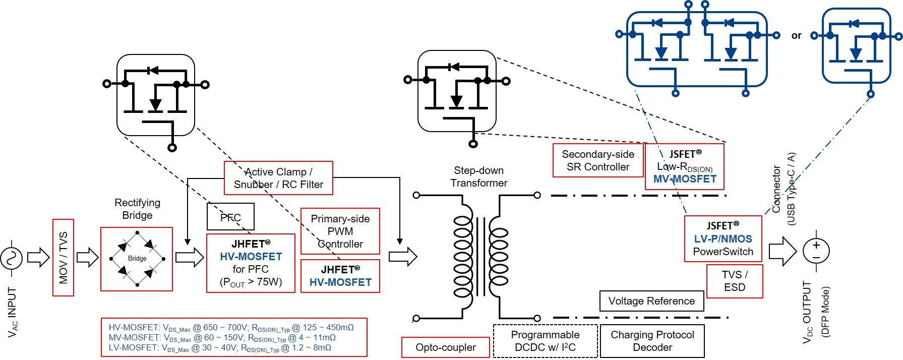 岂论在原边使用的是古板的超结高压 MOSFET、或是日益受电路设计工程师及消耗者追捧的氮化镓 D/E-mode HEMT, ,,, ,,在拓扑的副边, ,,, ,,德赢vwin线路先进 JHFET? 手艺平台超结 (super-junction) 的高压 MOSFETs 在原边开关、先进 JSFET? 手艺平台的中/低压 MOSFETs 在同步整流和在 USB-C? 端口电流输出开关等位置, ,,, ,,都能提供稳固可靠而高功效的运作。。。。。。。